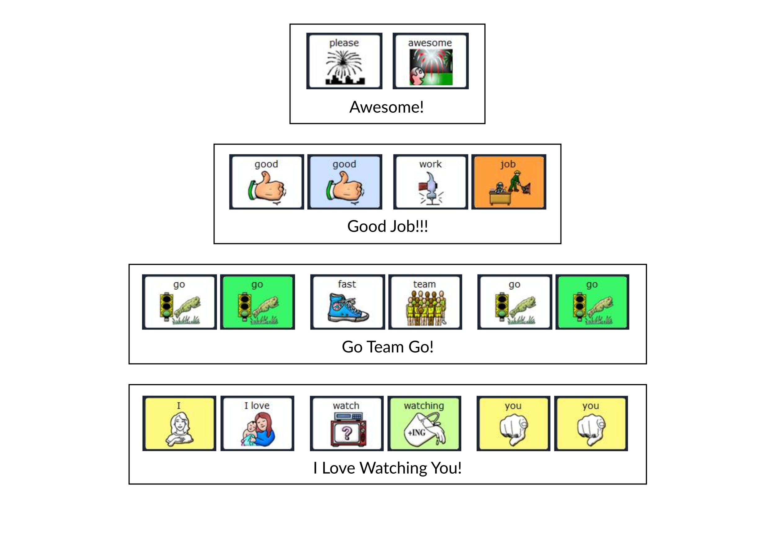 Tip: Consider what’s already on the child’s AAC system. What makes most sense of where to put these phrases, exclamations or questions? Maybe you could make a ‘sports shout outs” page under “Sports,” or maybe your “sports” page has the space.