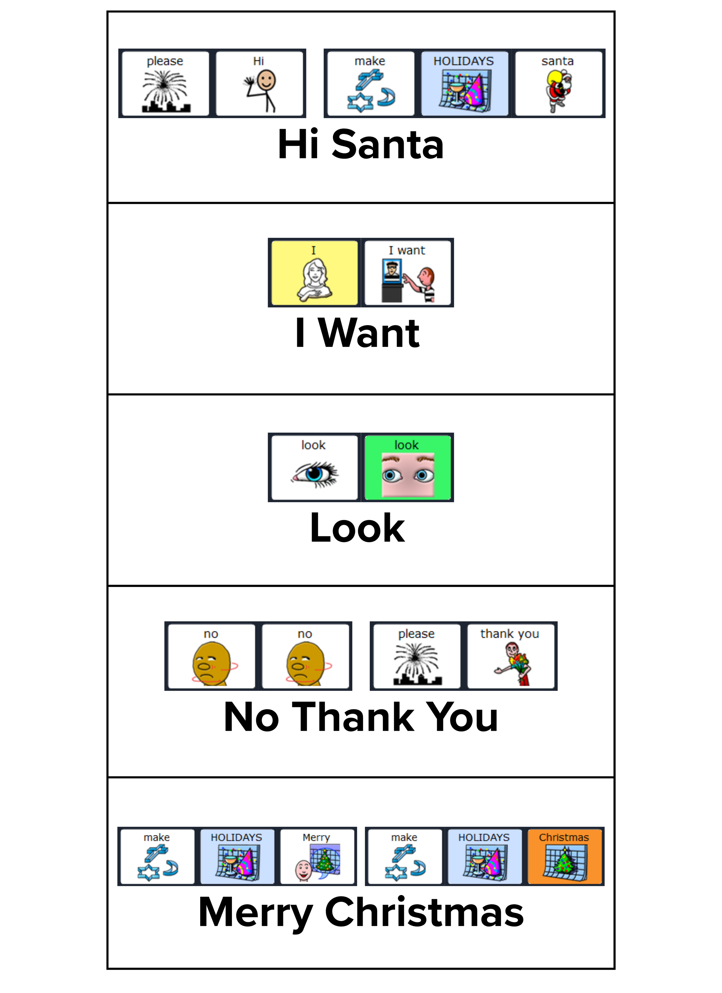 Using an AAC device? Explore words like SANTA, HELLO, LOOK, NICE, GIFT, BYE, I WANT, NO THANK YOU
